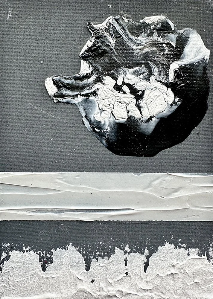 A charcoal ground holds a sculptural, lunar bloom pressed into the surface. Two pale bands and a frothy lower edge create horizon and weather, turning the miniature scale into something geologic.