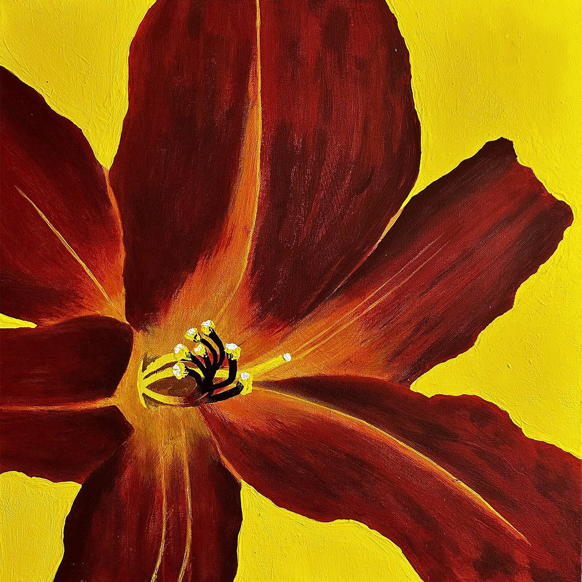 A close-cropped bloom becomes pure field and form: saturated maroon petals radiate across a punch of yellow ground. Soft glazing and edge feathers keep the image oscillating between flower and color study.